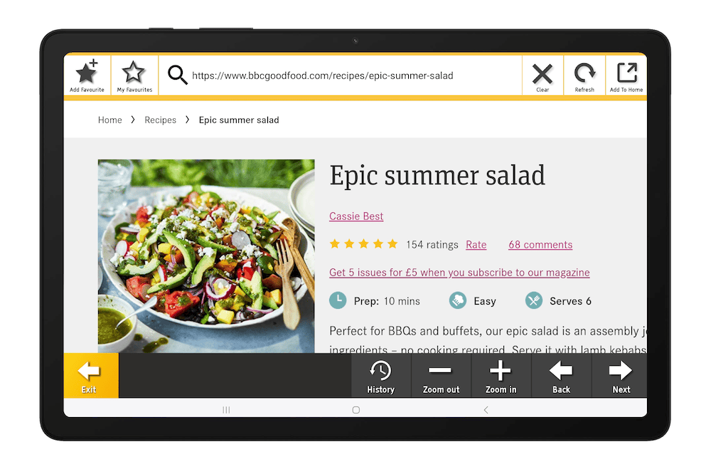 The Easology internet browser is designed to make browsing the internet easy. Use the ‘Zoom in’ button to magnify the page or save your favourite sites to revisit later. There is even a handy button that allows you to add any site to your home screen.