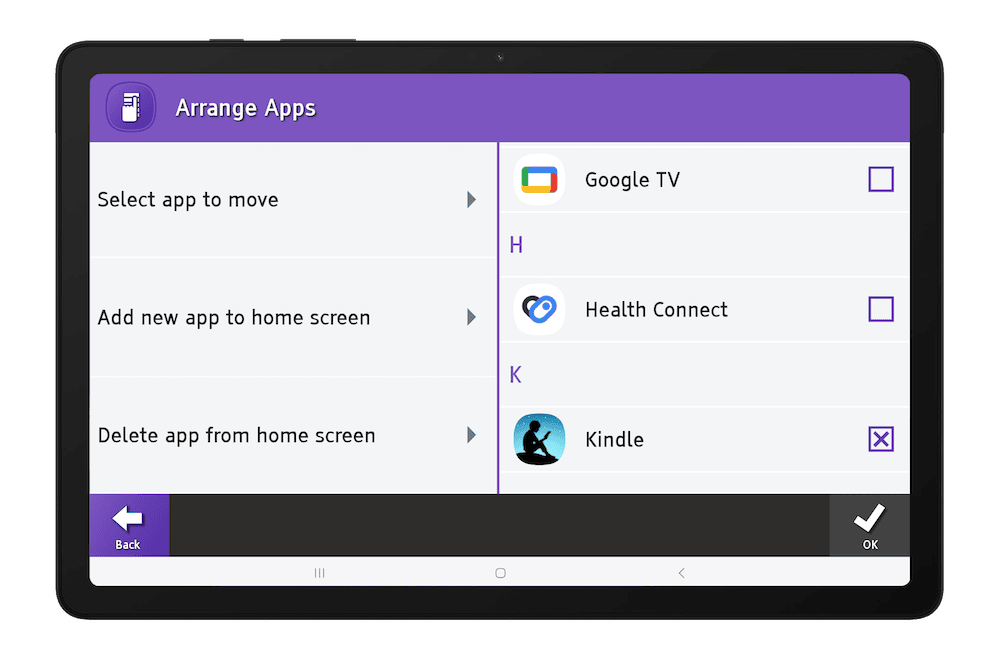 Make your home screen the way you like it. Use the tablet’s Arrange Apps function and add your favourite apps to the home screen, remove the ones you don’t want, and then put them in the order that suits you best.