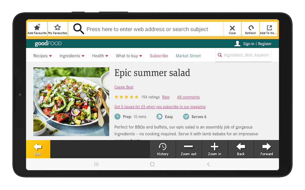 The Easology internet browser is designed to make browsing the internet easy. Use the ‘Zoom in’ button to magnify the page or save your favourite sites to revisit later. There is even a handy button that allows you to add any site to your home screen.