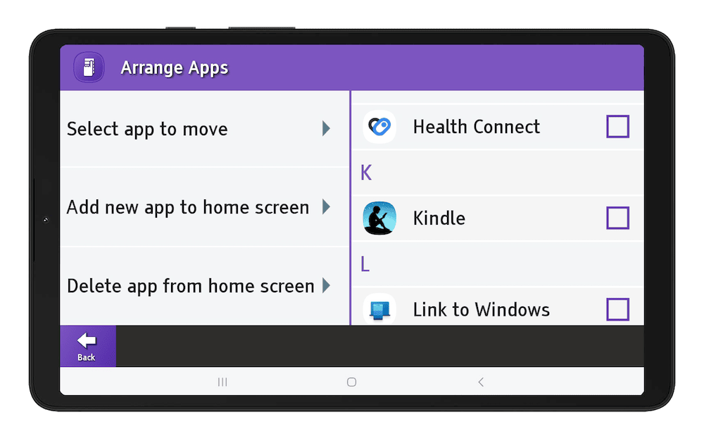 Make your home screen the way you like it. Use the tablet’s Arrange Apps function and add your favourite apps to the home screen, remove the ones you don’t want, and then put them in the order that suits you best.