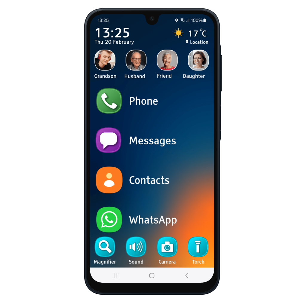 The home screen gives you easy access to your favourite apps and key functions. It also displays the time, date and weather for your area. In addition, you can assign up to 4 persons to your home screen so you can contact them at the touch of a button.